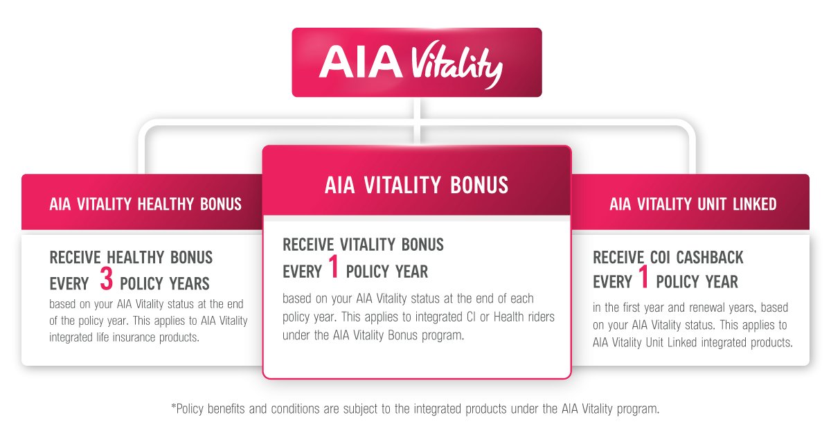 - Vitality Bonus is a cashback benefit for integrated products that include riders and/or endorsements under the AIA Vitality Bonus program. The bonus is calculated and paid annually based on the policy year. The Vitality Bonus rate for each policy year depends on the insured’s AIA Vitality status, ranging from a minimum of 0% up to a maximum of 20% of the standard premium for critical illness riders, and up to 15% of the standard premium for medical expense and daily compensation riders that have already been paid by the insured.