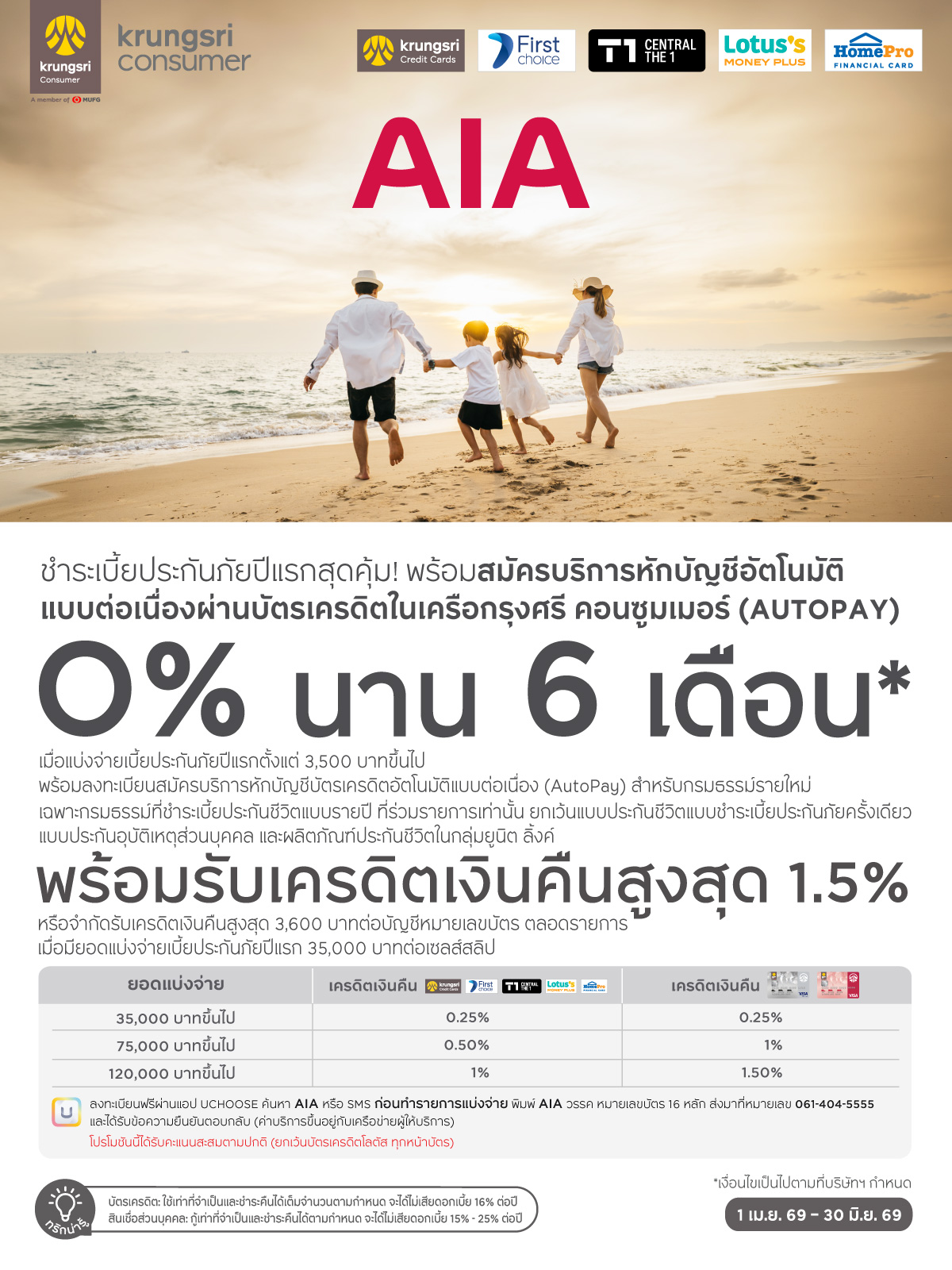 ชำระเบี้ยประกันภัยปีแรกสุดคุ้ม! พร้อมสมัครบริการหักบัญชีอัตโนมัติแบบต่อเนื่อง (AUTOPAY) ผ่านบัตรเครดิตในเครือกรุงศรี รับสิทธิแบ่งชำระ 0% นาน 6 เดือน
