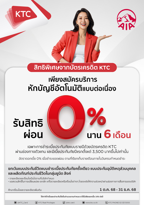 รับสิทธิผ่อนชำระ 0% นาน 6 เดือน เมื่อชำระเบี้ยประกันภัยปีแรกตั้งแต่ 3,500 บาทขึ้นไปพร้อมสมัครบริการหักบัญชีอัตโนมัติแบบต่อเนื่อง (AUTOPAY) ด้วยบัตรเครดิต KTC