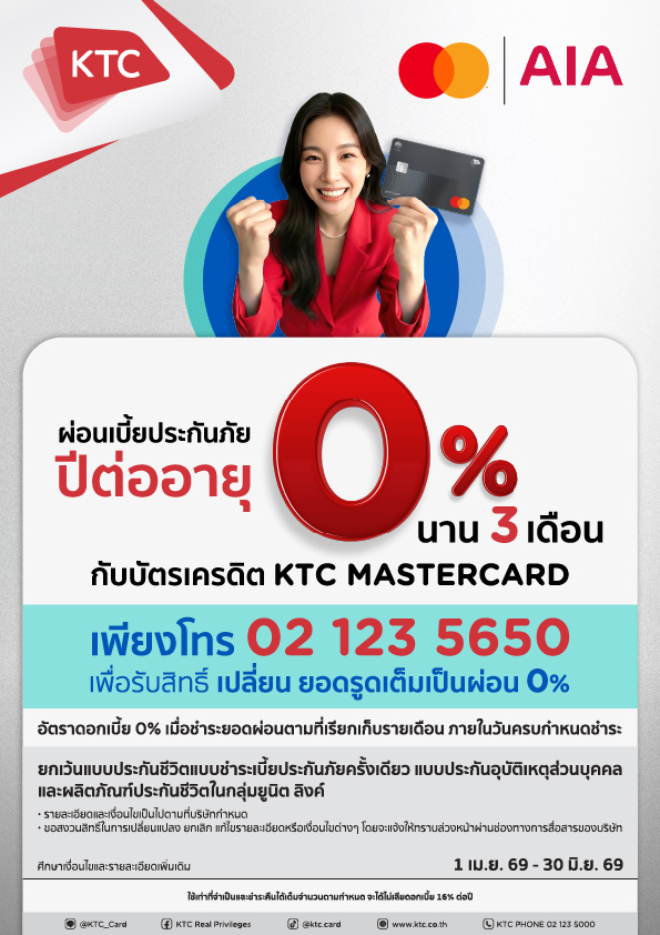 เมื่อชำระค่าเบี้ยประกันภัยปีต่ออายุของบริษัท เอไอเอ จำกัด ด้วยบัตรเครดิต KTC MASTERCARD ที่มียอดเบี้ยประกันภัยตั้งแต่ 10,000 – 50,000 บาทต่อเซลส์สลิป รับสิทธิ์ผ่อนชำระค่าเบี้ยประกันภัยผ่านบริการผ่อนชำระกับบัตร KTC 0% นาน 3 เดือนโดยทำรายการผ่านช่องทางโทร 02 123 5650