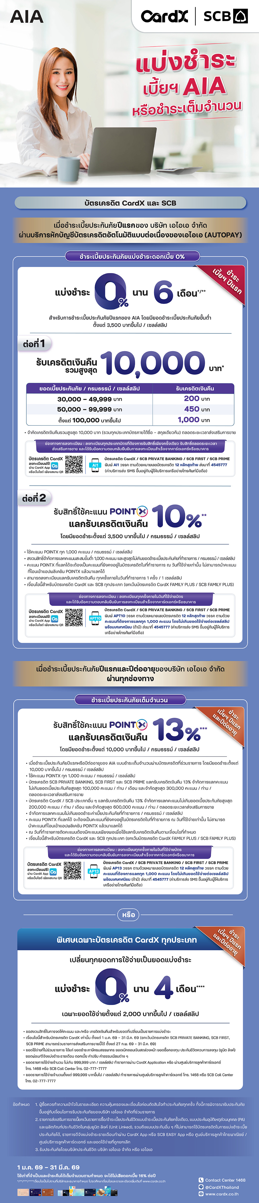 สำหรับการชำระเบี้ยประกันภัยปีแรกของ AIA โดยมียอดชำระเบี้ยประกันขั้นต่ำตั้งแต่ 3,500 บาทขึ้นไป / เซลล์สลิป ผ่านบริการหักบัญชีบัตรเครดิตอัตโนมัติแบบต่อเนื่องของเอไอเอ (AIA AUTOPAY)
