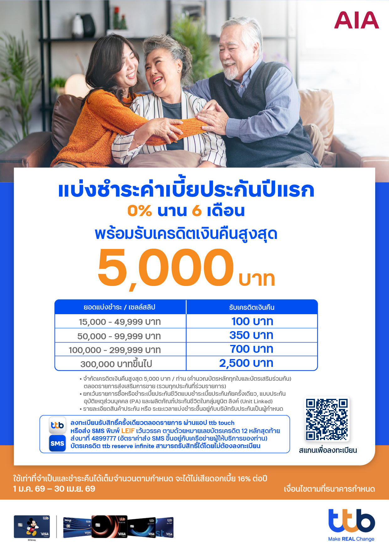 จ่ายเบี้ยประกันภัยปีแรก แบบแบ่งชำระ 0% นาน 6 เดือน (เมื่อสมัครบริการหักบัญชีอัตโนมัติแบบต่อเนื่อง) ด้วยบัตรเครดิต ttb พร้อมรับเครดิตเงินคืนสูงสุด 5,000 บาท