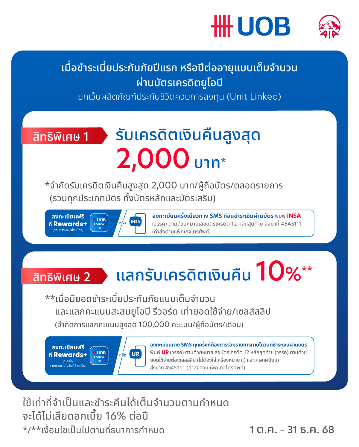 • ผู้ถือบัตรต้องลงทะเบียนผ่าน SMS มายังหมายเลขที่กำหนดไว้ในสื่อส่งเสริมการขายนี้ ตั้งแต่วันที่ 1 ต.ค.-31 ธ.ค.68 เท่านั้น กรณีผู้ถือบัตรหลักหลายใบให้ลงทะเบียนเพียงครั้งเดียว ก่อนชำระเงินผ่านบัตร (ค่าส่งตามแพ็กเกจโทรศัพท์) หรือลงทะเบียนร่วมรายการผ่าน บริการ Rewards+ บนแอป UOB TMRW (ไม่มีค่าใช้จ่าย) (ลงทะเบียนก่อนทำรายการ) ยกเว้นผู้ถือบัตรเครดิตยูโอบี รีเสิร์ฟ และยูโอบี อินฟินิท เข้าร่วมรายการได้โดยไม่ต้องลงทะเบียน SMS