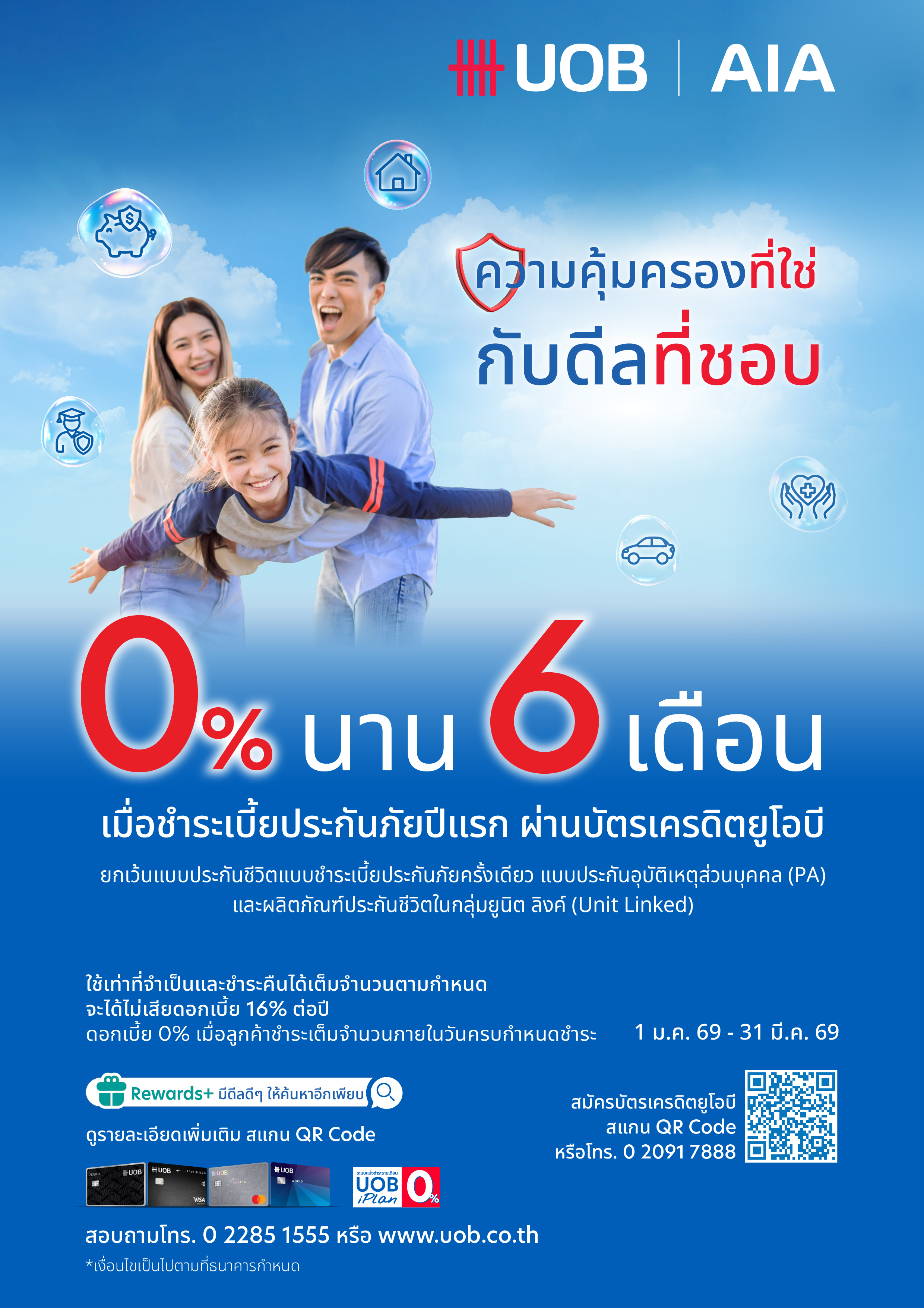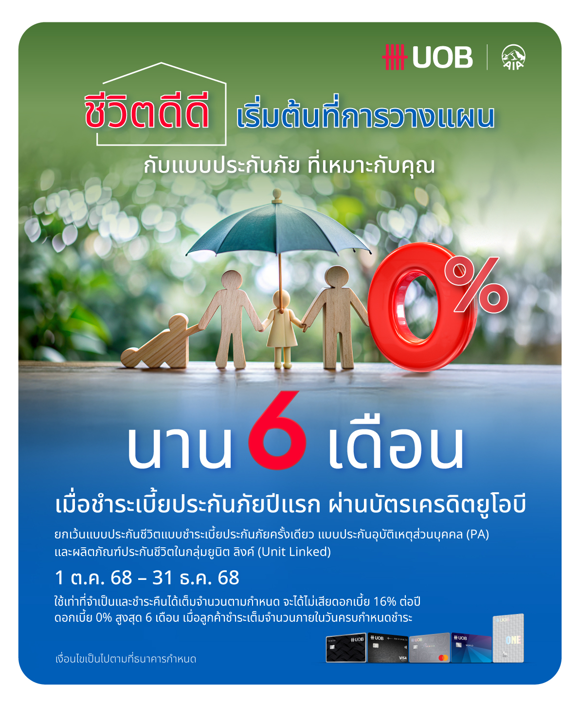 • รายการส่งเสริมการขายนี้ การทำรายการผ่อนชำระเบี้ยประกันภัยจะไม่ได้รับคะแนนสะสมแบบปกติ ในทุกหน้าบัตรยูโอบี