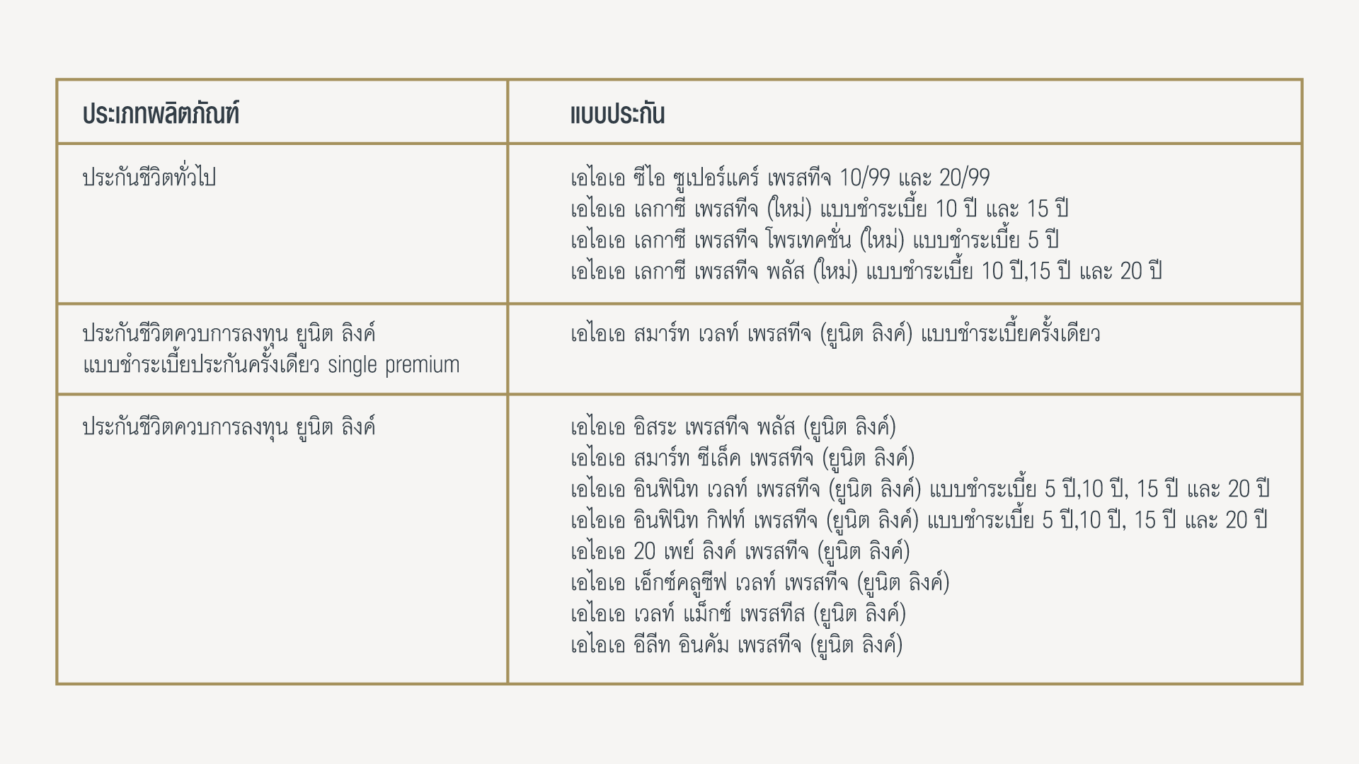 เงื่อนไขพิเศษเฉพาะผลิตภัณฑ์ประเภทเอไอเอ เพรสทีจ รับสิทธิ์เข้าร่วมโครงการฯโดยไม่กำหนดเบี้ยประกันรายปีชำระขั้นต่ำ การคำนวนเบี้ยประกันและระยะเวลาให้สิทธิเป็นไปตามตามข้อกำหนดของโครงการฯ รายละเอียดผลิตภัณฑ์ประเภทเอไอเอ เพรสทีจ มีดังนี้