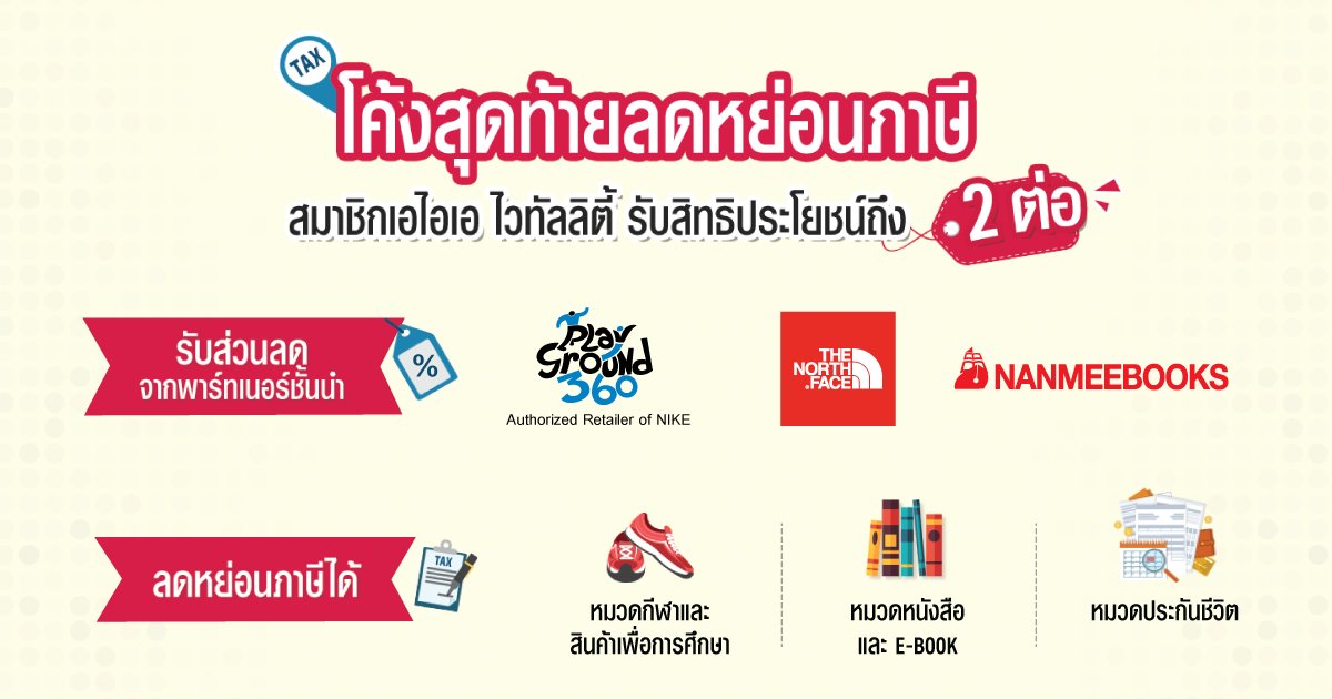สมาชิกเอไอเอ ไวทัลลิตี้ รับสิทธิประโยชน์ถึง 2 ต่อ ทั้งรับส่วนลดสินค้ากีฬาและหนังสือ แถมยังนำใบเสร็จไปลดหย่อนภาษีได้อีกด้วย