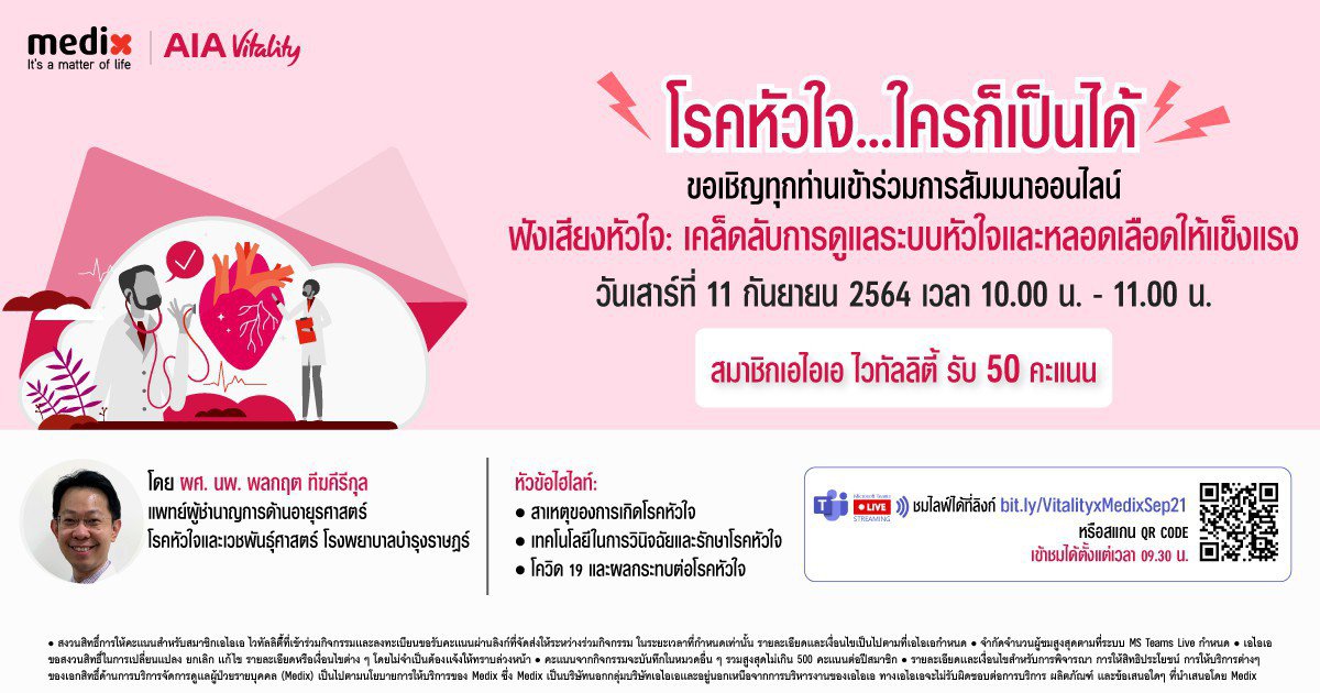 เอไอเอ ไวทัลลิตี้ร่วมกับเมดิกซ์ (Medix) ขอชวนสมาชิกเอไอเอ ไวทัลลิตี้และผู้สนใจ ร่วมฟังสัมมนาออนไลน์ AIA Vitality x Medix Health Talk 2021 ในหัวข้อ “โรคหัวใจ...ใครก็เป็นได้” ฟังเสียงหัวใจของคุณและรับฟังเคล็ดลับการดูแลระบบหัวใจและหลอดเลือดให้แข็งแรง โดย ผศ. นพ. พลกฤต ทีฆคีรีกุล แพทย์ผู้ชำนาญการด้านอายุรศาสตร์ โรคหัวใจและเวชพันธุ์ศาสตร์ โรงพยาบาลบำรุงราษฎร์l